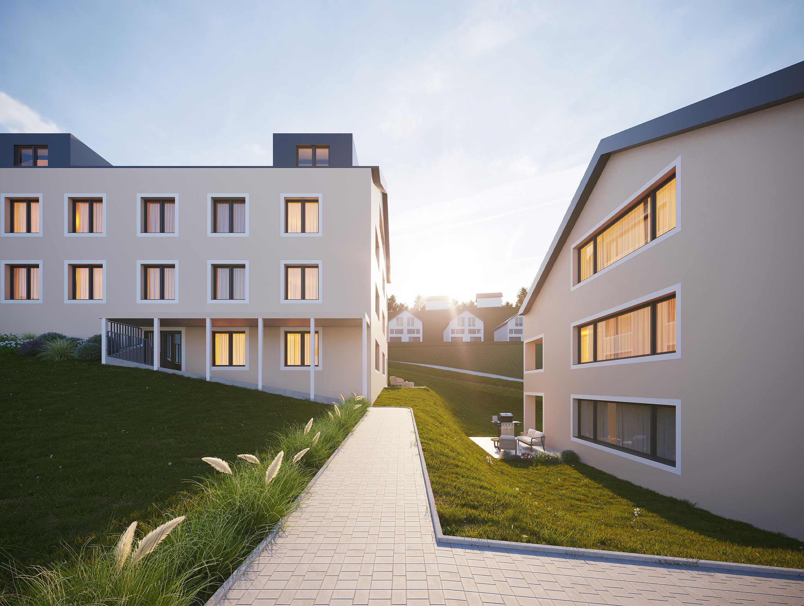 An bevorzugter, familienfreundlicher Wohnlage in Heiden, angrenzend an die Landwirtschaftszone, entstehen zwei moderne Mehrfamilienhäuser mit insgesamt 13 Eigentumswohnungen. Die Tiefgarage mit 21 Einstell- und 4 Besucherparkplätzen bietet ausreichend Parkmöglichkeiten für Personenwagen sowie Fahrräder. Die leicht erhöhte Hanglage, an der sich die Bauparzelle befindet, ermöglicht eine schöne Weitsicht – unter anderem auf das Dorf Heiden. Die südliche und westliche Ausrichtung der Loggias gewährleistet eine optimale Besonnung.